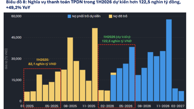 Trong nửa đầu năm 2026, d#242;ng tiền cần thanh to#225;n từ tr#225;i phiếu bao gồm cả gốc v#224; l#227;i dự kiến ở mức 122,5 ngh#236;n tỷ đồng tăng 49,2% so với năm ngo#225;i...